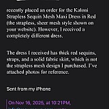 I ordered a specific dress—the Kaloni Strapless Sequin Mesh Maxi Dress—and paid almost $430 for it. Instead of the dress shown on their website, they sent me a completely different red dress with a totally different design.