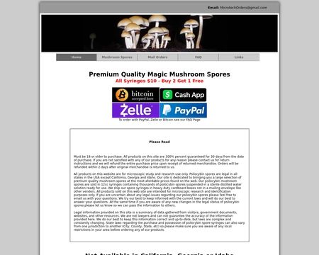 My 1st online spore purchase was with this POS! I sent a money order for $17.00, for a single syringe of B+ spores. After 2 weeks of nothing, I sent a Email, Got a response of we haven't received your order yet, give it a week. After a week, nothing. So email # 2, and still, " sorry still didn't receive it, but I'll ship it next week"?!? After about 5 weeks total... FINALLY received my syringe of ***WATER***! Whatever you do, AVOID this site!