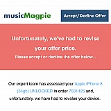 Like many of the other reviews on here, I sent a phone to music magpie to sell and received a ridiculous revised offer. The phone had a few scratches and so I selected "poor" as the condition, however they still originally offered me £152, which I was thrilled with. I sent the phone away and, after the quality assurance check, they revised the offer to £41 due to the camera not working. The camera worked perfectly fine prior to me sending the phone. Even if the camera had been dysfunctional, I'm unsure as to how this would take £111 off of the original value. Surely, £111 out of their £153 original valuation was not based on the value of the camera alone. I believe they lure you in with an unrealistic offer, and then hope that once you have sent the phone already you will accept their lower offer to save the hassle of getting it back. I would get more money selling it for parts than I would accepting their £41. It's a joke.