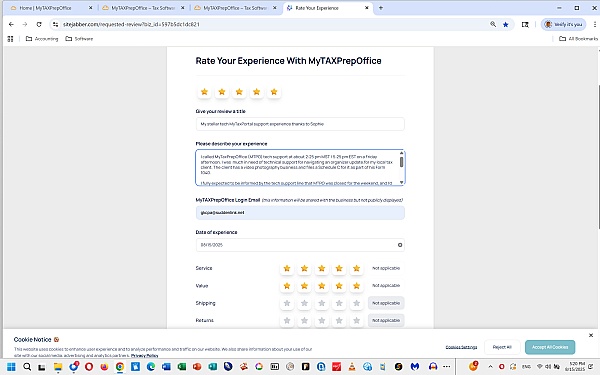 Would like to share that, I feel at ease and support by MyTAXprepOffice, after 3 yrs with another software company. MyTaxprepOffice are always available for support and there products are affordable and many of them included with price. My clients are happier, due to the friendly Portal and I see my self being able to work on a profitable year.