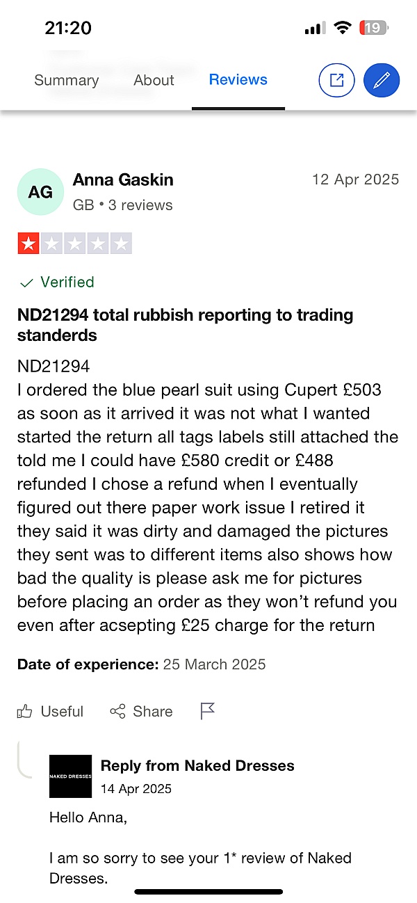 Answer: The Naked Dresses team was so cooperative. I was in contact with someone from their team (in the UK) within just a few hours, despite being in Australia.
