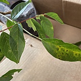 I ordered an Amethyst Falls Wisteria tree in a #1container. It was buy one get one free so I received 2. They were to arrive on Friday 7, July but came late afternoon on Saturday. I opened the box but did not remove plants because they were stapled in place and there were too many mosquitoes in the garage. Sunday I saw that the plants did not look healthy and did not look like trees but rooted wisteria branches. In the pictures perhaps you can see the yellow leaves and leaves with holes and black spots. The very last photo is from their web site. It is a fountain wisteria in a #1container. I was told that is a mature tree and I should not have expected that. I was also told that the trees had been sprayed after they were brought out of the field. I was also told this time of year leaves yellow from too much water. I get all that, but I paid $65 + $20 shipping for these overwatered and eaten sticks!
