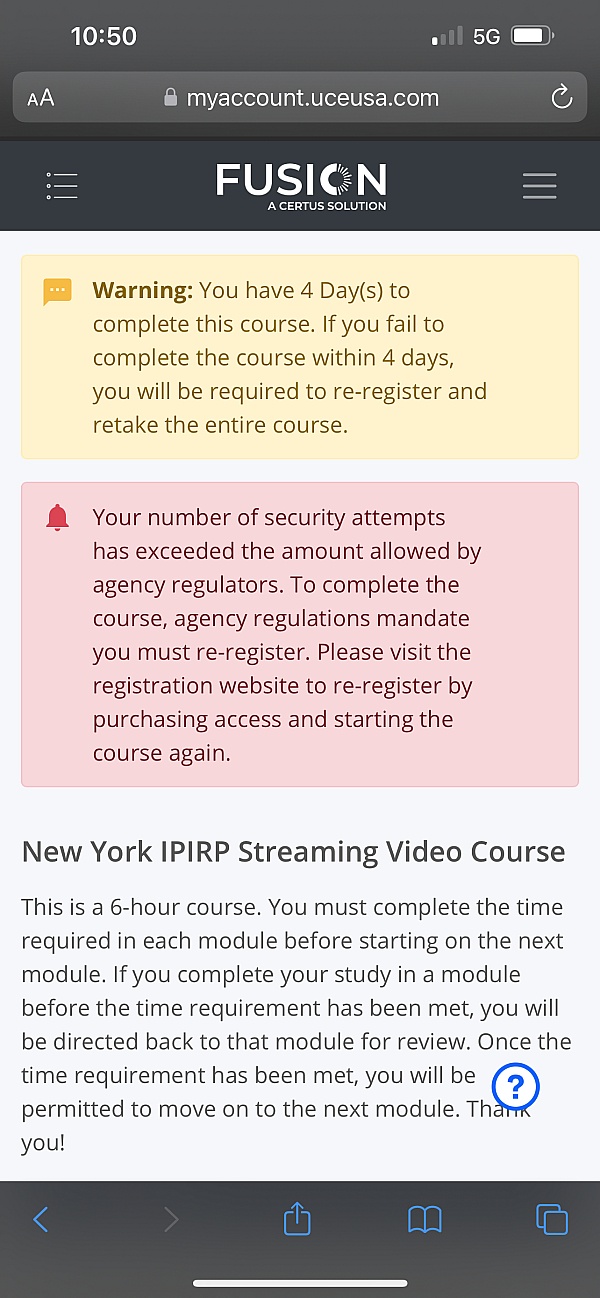 Signed up for what I thought was a different program through the NY Safety Council and ended up BACK WITH THE SAME TEST WITH CERTUS. Turns out it's backend service by Certus with multiple front end entry points through reputable companies. And their program is not even mobile device compatible. Forget about trying to click the tiny arrows in their horrible UI on your phone.