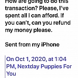 I paid $25 for the background check then 2050 for the puppy then was asked to pay 2.5k for shipping which I was shocked. I was previously told no other fees. Could not afford that. I am out all my money and no puppy. I am an old working nurse and am now heart broken. What happens next? Here is a picture that states sold. Can anyone help me. When I checked on the business, Nextday PETS, I thought it was legit
