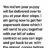 When you see low pricing and free shipping it is a set up. They respond by text very quickly but when you call and ask them lots of questions they start to fall apart. When we asked to see the papers on the puppies parents and other documents They refused and made up some poor excuses.
