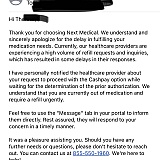 Horrible customer service you email and call nobody gets back to you. So that means you don't have your medicine for a couple of weeks, you call back you call back still nobody answers and you're on hold for an hour and a half. When you said an email You get a standard email back and it said it will get back to you within 24 hours. You never do. Avoid this company at all cost. It is rip!