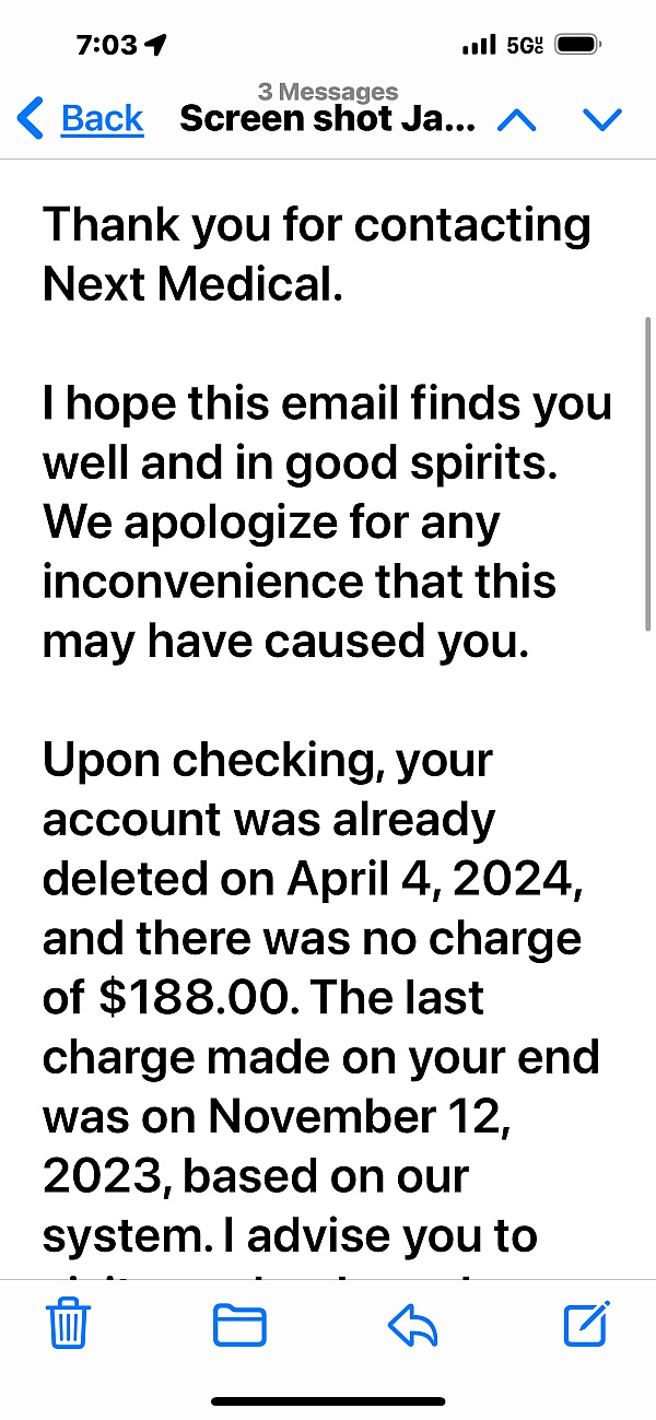 Should you have any additional comments, concerns, or suggestions, please feel free to reach out to us at team@joinnextmed.com or contact us on our customer service hotline at 855-5501-960. We value your input and would appreciate the opportunity to address any issues and make amends. Your satisfaction is our priority, and we hope you will consider giving us another chance.