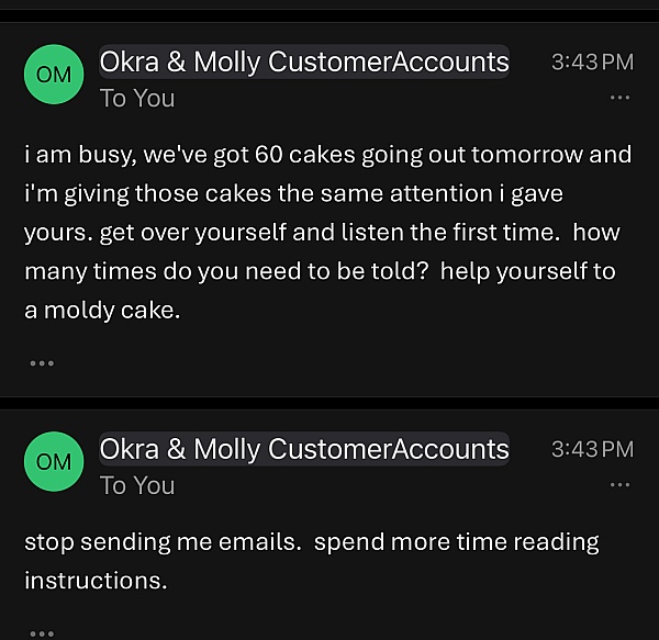 In summary, my experience with Okra & Molly was a mix of delight and disappointment. The cake itself was a masterpiece of taste and aesthetics, showcasing the bakery's culinary prowess. However, the shadows cast by a missed delivery, a misspelled name, and an unsatisfactory response to my concerns left me questioning the quality of their customer service. As a customer who was ready to be won over by their offerings, I am left with a bitter taste in my mouth – a sentiment that, unfortunately, overshadows the sweetness of their cake.