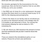 My shoes don't fit, nor do I find them comfortable, so I emailed the company. There's no simple solution, but here are the three that were given to me: 1) keep the shoes that don't fit and pay to have new ones shipped 2) pay to ship back to China, wait 2-3 months, then pay for a 15% restocking fee or 3) don't send shoes back and get a 30% refund.