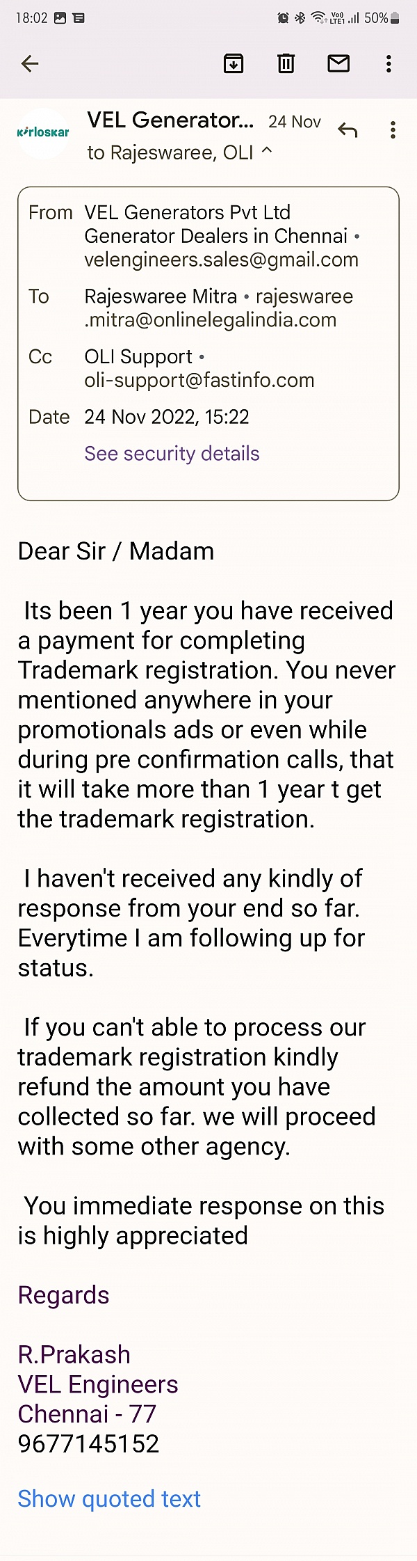 Thank you for completing my GST registration within quick time. I recommend online legal India to all.