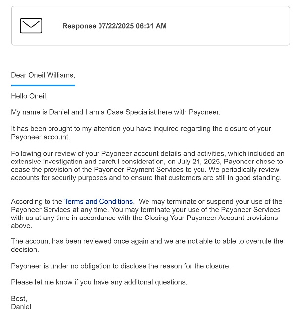 Answer: Hi there, I am sorry to hear about this. Please provide the ticket number associated to the email correspondence you had with our Support center. If you are unable to locate this number, please provide your customer ID and email associated to your Payoneer account. Thanks, The Payoneer Team