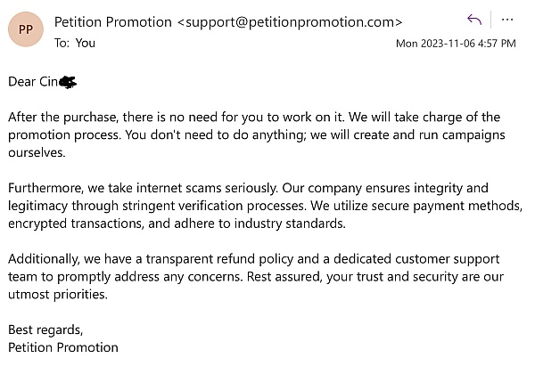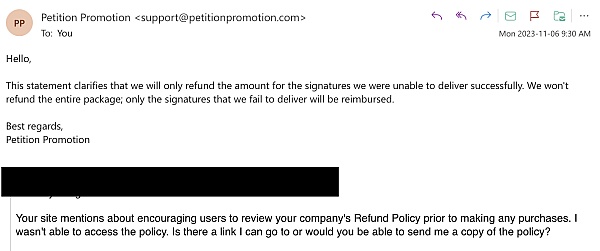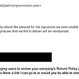 All I know is that even before purchasing the "GoGeek" package from them, I had inquired at length about their refund policy, and they claimed that they would absolutely provide a refund if they fall short of their promised results, according to how many signatures they fail to deliver successfully. Well then, please issue my group a FULL refund ASAP as you didn't have the decency to even begin to help us, after 2 full months now. Talk about a waste of our time, and we could have been actively marketing our petition ourselves instead of relying on your company's inactivity.