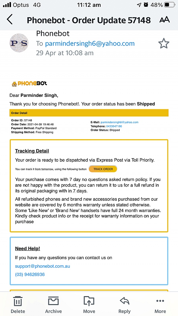 I bought a refurbished iphone feom Phonebot. Good deal, very approachable people, quick response to my queries, and fast delivery. Loved my experience with you guys, keep it up Phonebot team! Oh by the way your chat service is great too so much better than what i have experienced with the likes of Telstra and Optus. Overall very satisfied!