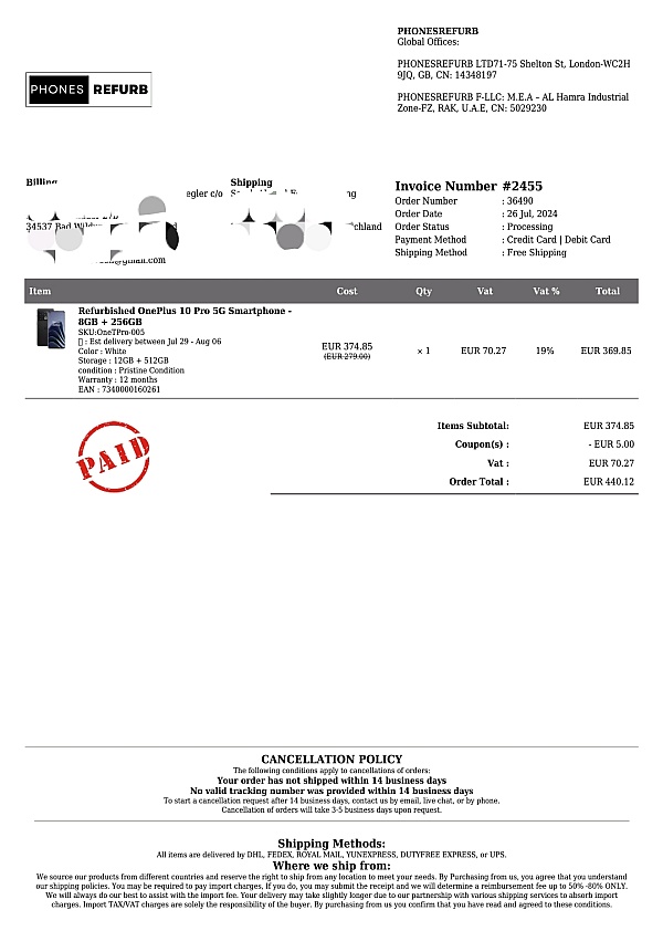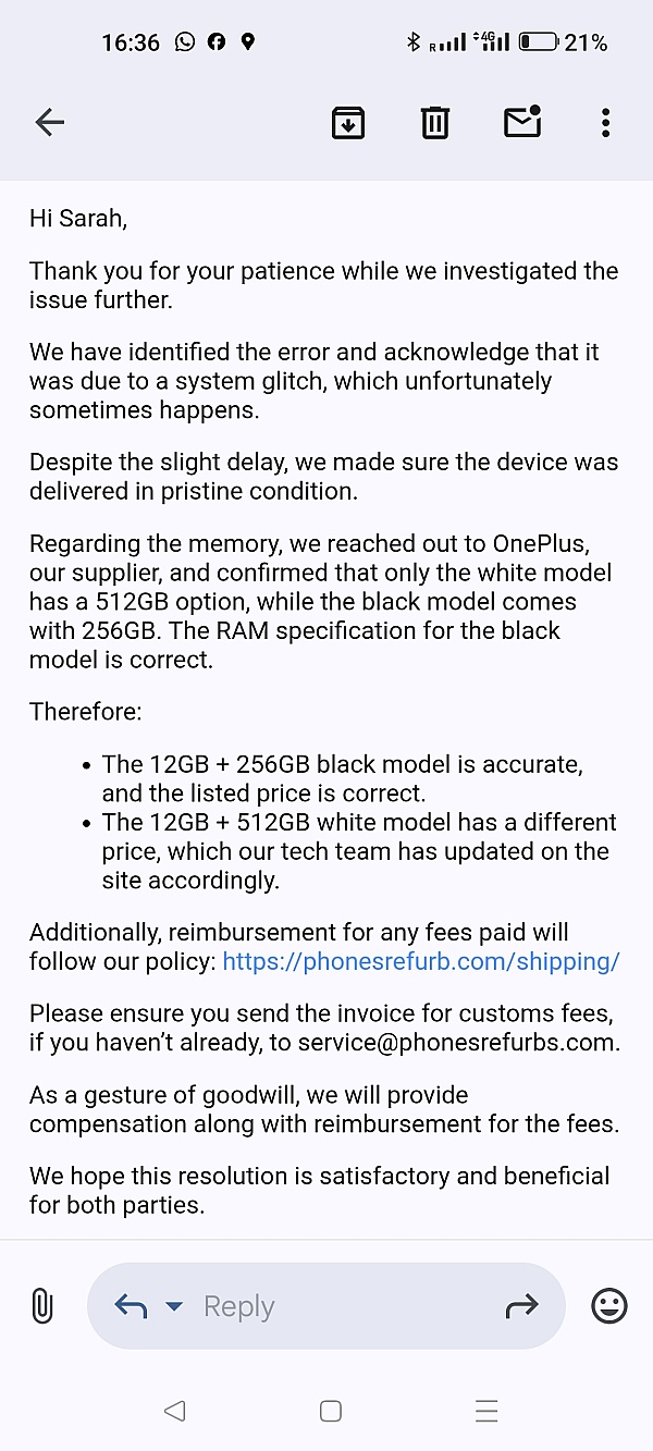 I'm sharing my experience with Phonesrefurb, and I must say I'm deeply disappointed. I purchased a phone (OnePlus 10 Pro with 512GB of memory), but what I received was a OnePlus with only 256GB. When I reached out to them to address the issue, they claimed that the incorrect listing on their website was a mistake and insisted that the phone I received was the correct one. They admitted that the issue was due to a system glitch, which "unfortunately sometimes happens" — although that's not my problem, by the way.
