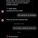 I sent a direct message on Instagram to Susan letting her know about my issue, and this was still her response, "HelloPlease email us with your oder number at (support email address). Thank you.". The support team still did not assist me. When I send emails, all they can say is, "Hope you get your package asap". It's now 2023, and I have still not received my package.