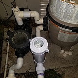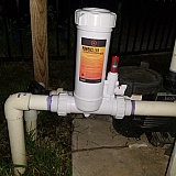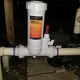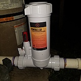 PowerClean Ultra In-Line Chlorinator - Clear Glass Lid, CTM-45-4001, $119.15. Exactly what I needed, a chlorinator that really works, at an excellent price, quick-shipped, with all the fittings needed for installation, except for the PVC cleaner and glue, of course. Photos: 1 - The white flow indicator is letting me know the system is working. 2 - The glass top lets me easily see if I need to add new chlorine tablets. 3 - Pool pump is off, no flow indicated. 4 - Photo from the opposite side.