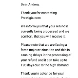 As other reviews have indicated, it is likely that Prestigia is having liquidity issues and trying to use customer funds to help bridge their cash needs through the Covid crisis. I was careful to make a refundable booking in early April (well after the crisis had unfolded) for a stay in July. However, after coming across reviews like the ones on this site, I became nervous and canceled the booking within 8 hours of my booking. As I feared, Prestigia refused a refund, offering a credit that I am unlikely to ever use. I tried to reason with their customer service and they refused to honor their terms, and invoked "Force Majeure" -- I am not a lawyer but 1. Doubt you can do that to deny someone their rightful funds and 2. If they had done so, they should have updated their terms on their website. My suspicion is they are offering bargain prices just to get a hold of customer funds -- these are likely "bait and switch" prices that they will never honor.