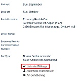 I had a hell of a time dealing with the car rental spot when I went to pick up the car, as apparently there are many other fees that they try to make you pay, even if you have sufficient evidence that you do not need it. Regardless, the person spoke to me aggressively about the necessity of me needing to pay for insurance, etc. No conversation with me about any sort of limits on kms. From purchasing the car through Priceline and picking up the car, the information provided was that everything was the way it was through this purchase.