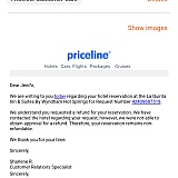 We confirmed with Priceline in October 2023 we were charged for an item we should not of been. We provided all the information they requested. Now we are in February 2024 and after many, many calls and emails all they keep repeating is to call them. Very questionable business practice. I do not recommend them at all.
