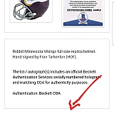 Purchased a Viking football helmet with a Fran Tarkenton signature. Evidently they send out stickers to be autographed, then place the decals on the helmet after. The decal(s) were not put on the helmet properly; resulting in large bubbles and folds, the edges of the decals aren't affixed, the two horn decals weren't even put on symmetrically... and then to top it off the lining of the helmet has dried glue and is falling out. This item was supposed to be in perfect condition according to their description- but it wasn't even close to being in a condition that could be given as a gift (intended purpose) or viewed as a collector's item- if I someone gave it to me I'd think it was a joke. They failed to respond within the time they promised, and then when they did, finally... the response was that I should go out and buy a heat gun to fix it. Seriously, that's what they said LOL!. NEVER will I ever buy anything from these douches again. They're scam artists.