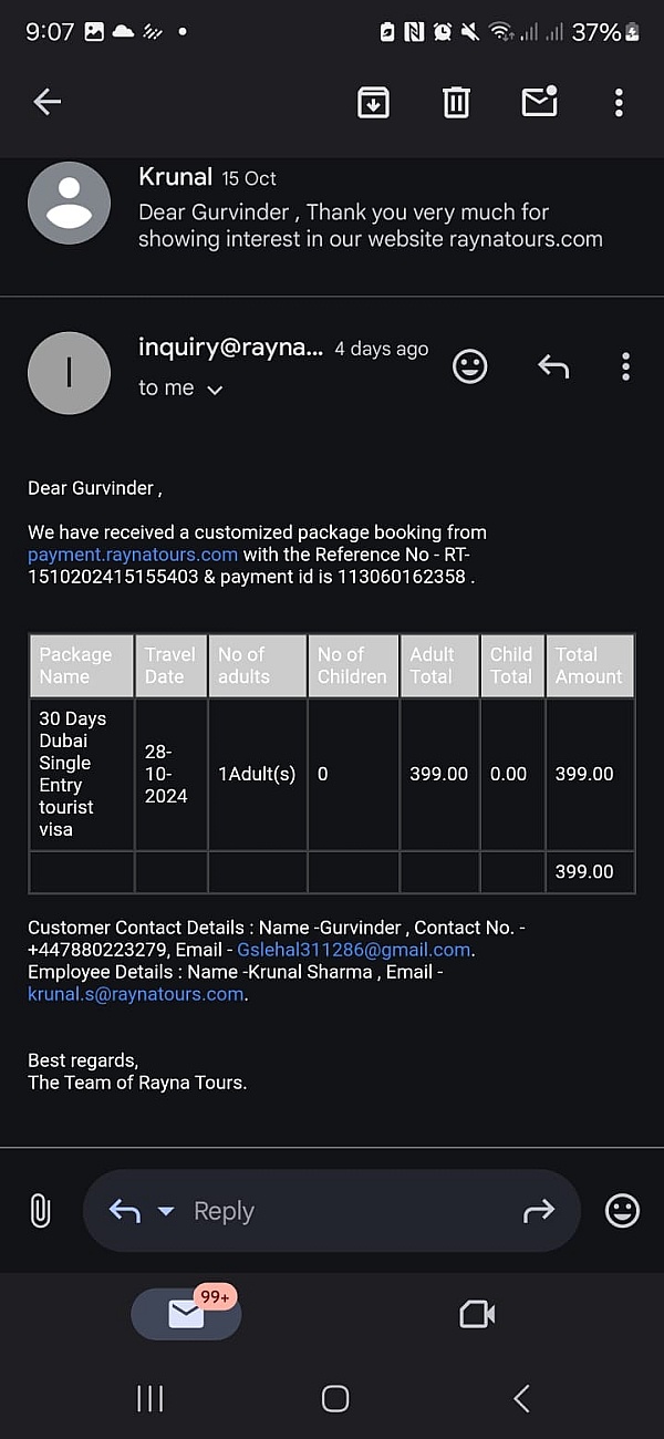 I had an extremely disappointing experience with Gurvinder, a consultant at Rayna Tourism. Despite repeatedly following up on the status of my visa, I was informed after much delay that my visa had been rejected. However, when I requested the official rejection email from the UAE authorities, Gurvinder failed to provide any authentic proof. Neither the original rejection email nor any fee confirmation was shared with me.