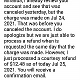 Response, as a courtesy we are refunding $12.95 (half) because we can only do full refund if you tell them the same day they charge your card. Yah, was charged today, emailing requesting refund today. Cancelled 2 days ago. Full refund should just be a given without dealing with this lame BS.