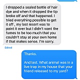She brought many loads of laundry to wash. She dyed her hair red in my house. Ruining my shower curtain, a bath towel, a hand towel. There is red dye up the walls in my hallway and baseboards. Baseboards were broken with her trying to clean the red dye off. She admits she can't get it off and the walls and baseboards need painted. I have 2 year old continuous flooring. The red dye is tracked across the floor. She took up the visqueen plastic in the office saying it didn't work. Because she left the animals all locked up in rooms. The floor and baseboards of this room are urine soaked to the point that urine seeped under a closet door and soaked a box. She admits that she left my door open and left my property with the animals all locked up to air the house out of their party.