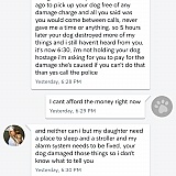 I had to go get vet care for one of my dogs bc of her terrible care & neglect of my pets, my cats were terrified and traumatized... I worried for a few days whether my animals would recover. I have to have my home professionally cleaned after she was smoking marijuana and cigarettes in it! She literally killed numerous plants by overwatering them when I strictly told her she was only here to care for the animals and nothing else. I said DO NOT water!