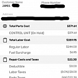 I had a problem in my refrigerator freezer. The tech came to my home for 5 minutes and did the diagnostic test: Parts (Switch) $83, Labor $405.95, Total after taxes and all things $494.93. We have to change a switch, that's all.