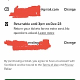 SeatGeek is not upfront and honest about refunds. I bought some tickets for the TSO Christmas concert for my parents and I as a Christmas gift but had to return them because plans changed and they were concerned being around so many ppl with omnicron. Before buying the tickets SeatGeek said that you could return tickets up to 72 hours before the event. This is the reason I initially went with SeatGeek. I thought if we had to cancel, they'd make it easy. But nope.