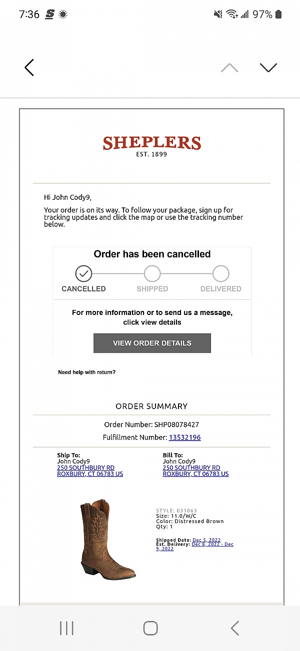 The single worst online buying experience I've ever had. Tried to exchange for a new size. Haha. I won't get into details, but after over a month, I gave up and ordered from BootBarn. I did get my refund (minus shipping) but I didn't want a refund. I honestly don't know how this company is in business. Definitely not up to par with today's shipping and customer service expectations.
