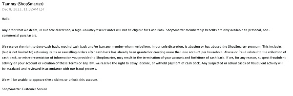 Our program does have rules that we ask our members to abide by. If an account is locked due to possible fraudulent behavior, the member certainly has the opportunity and the right to explain. We send them an email once we lock their account, and will also issue a refund immediately to the member if we do not reinstate their account. Furthermore, when a members account is locked, we explain exactly why the account was locked. We do have terms and conditions which we ask our members to follow. We ask that ShopSmarter.com is used for personal use only. ShopSmarter.com is not for high volume, resale orders and also can not be used for business purposes. We also only allow one membership per household. If you do not believe these terms are fair, please let me know, however if you shop through your account for personal use, you would have no need to worry about your account being locked.