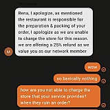 Terrible s customer service. Would not refund an inedible order. Only 25% apparently. So who takes responsibility here? What am I paying for?