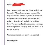 Hi, spencer. We are sincerely sorry for that. Currently our customer service has over 10k letter to reply one by one, we will response you ASAP. And it's shopping season now, the shipping will be slower than before. Sincerely sorry for this. Hope you understand.