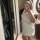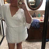 This dress was a little deceiving. When I ordered I expected a white dress, but this is definitely more of an ivory. I was a little disappointed in the sizing chart as well. I am usually an XL and I would definitely say that this dress in particular runs large. I probably could have sized down to a medium. Since this was a last minute purchase I had to use it for my pictures even though it was not what I envisioned. Hope this review helps!