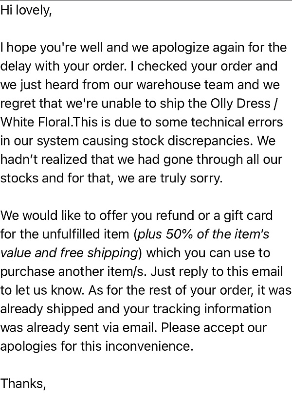As a first time shopper here I was very satisfied with the quality of my items. Though I had brought a top and skirt which was part of a set. I was told all my items had been shipped and then the next day found out the top was not coming and I could either have a refund or a voucher. I chose a voucher and found a different top but when I asked if I could still have the free shipping as my order had exceeding the $50 mark, I was told I could not and would have to pay for postage at my own expense! The fact that I couldn't return the skirt considering I couldn't get the matching top was also quite upsetting. These policies led me to go else where for a top. It was quite upsetting to see a business with such high quality products have policies such as this. Not sure how I would feel shopping here again with this in mind.