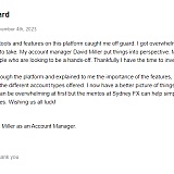 I was assigned Christopher close to two months ago when I set up an account with Sydney Fx. Christopher speaks from experience and is always supportive of my decisions. One of the first things that Christopher told me is to always listen to my gut, no matter what anyone else says, at the end of the day this is my account.