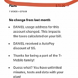 I was with Sprint for years and they were bought out by T Mobile. Back in July, they had a promotion going on if you migrated your account with T Mobile, you basically got a free phone when turning in your old phone. I asked the associate at the South Tampa Gandy store if my bill would go up, and he informed me it would by about $10-$15 a month. Fast forward to a few months later and my bill went up around $37 a month. I called TMobile 1800 # and after going back and forth for an hour, the customer service rep asked if he could call me back the next night once he spoke to his manager around the same time. This was around 7pm my time. The next night I don't get a call, but I wake up to a voice mail from the customer service rep, who called me at 1:30am and told me there was nothing he could do for me. Yes, I said 1:30 am. I went back to the store and the associate who helped me was no longer there, but another gentleman was. He looked at my bill and said that in order to give me the deal I was promised, he couldn't make my monthly bill the promised amount I was told, but he would take $80 a month off for the next 6 months and that would basically even things out. I agreed to that. After my bill being $80 less that month, the following bill was back to the $123 it had been. Not the $43 the gentleman told me it would be for 6 months. I went back to the store again, but this time the store was closed down. Finally having enough of their shadiness, I paid the iPhone off, so I could have the phone unlocked and went with a different carrier. If you do business with TMobile, you are getting what you ask for. The first pic attached shows what I was billed and what was told to me $100.11 and what they charged me each month. After. The second pic shows the gentleman taking the $80 off and what my bill should have been for the next 5 months.