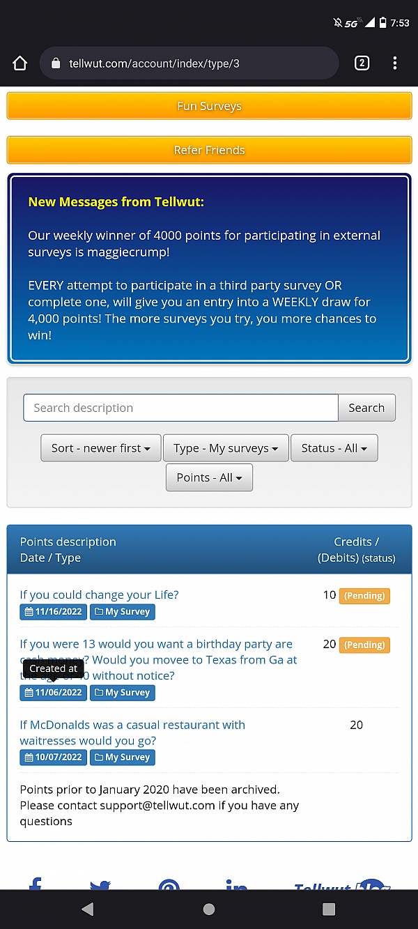 Tellwut is one of the most trustworthy sites out there. If there is an error and you don't get your points, all you have to do is email customer service and they will correct the problem. I have always heard back within one day and the problem is always resolved to my benefit. Tellwut is easily the best survey website to deal with!