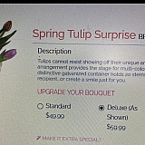 I ordered an all white bouquet of roses and Lily's... I also ordered the upgraded version of this... When the flowers arrived it looked like a bouquet of green carnations with a white rose and pink Lilly. Was not worth close to the 100 plus dollars I spent. All around I feel ripped off and wish I could give no stars. The phots are what I ordered With an upgrade compared to what arrived... Don't use this place!