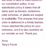Terry's Florist repeatedly told me they'd call me to let me know the status and never did. If I hadn't kept calling myself, I would have never heard from them. When I asked for a refund or for a fresh bouquet to be sent to the recipient, I was told to email them photos of the actual flowers so that they could see if I qualified for either -even though it was their mistake- so I did so. That was 3 weeks ago and I still have not heard back from them.