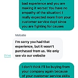 I contacted Thrive Causemetics to advise 3rd party is selling their products that are no good. I advised I didn't want a refund just to talk about the situation. The agent Melody was awful no empathy or sorry at first she said this That is third pary person we only sell via our website. If you purchase it from someone or somewhere else we cannot honor any returns or refunds. Again I told her I don't want refund just to make them aware of situation and bad make up. She then said says: you would need to go back to the seller, since it wasn't purchased directly from our website. I then advised her that her customer service skills have no empathy or apologies and that due to this I won't be buying from them any further due to her. She said I listened to your issue, and I'm sorry you experienced that. But like I said we only sell via our website. The only thing I can do is redirect you back to where you purchased it. So if you want good customer service you will not receive from this company. The conversation from her side I copied and pasted they are legit from our conversation. Thrive needs to improve their relationship skills. I will no longer buy from them or tell others about them. I will tell people that customer service with this company is awful.