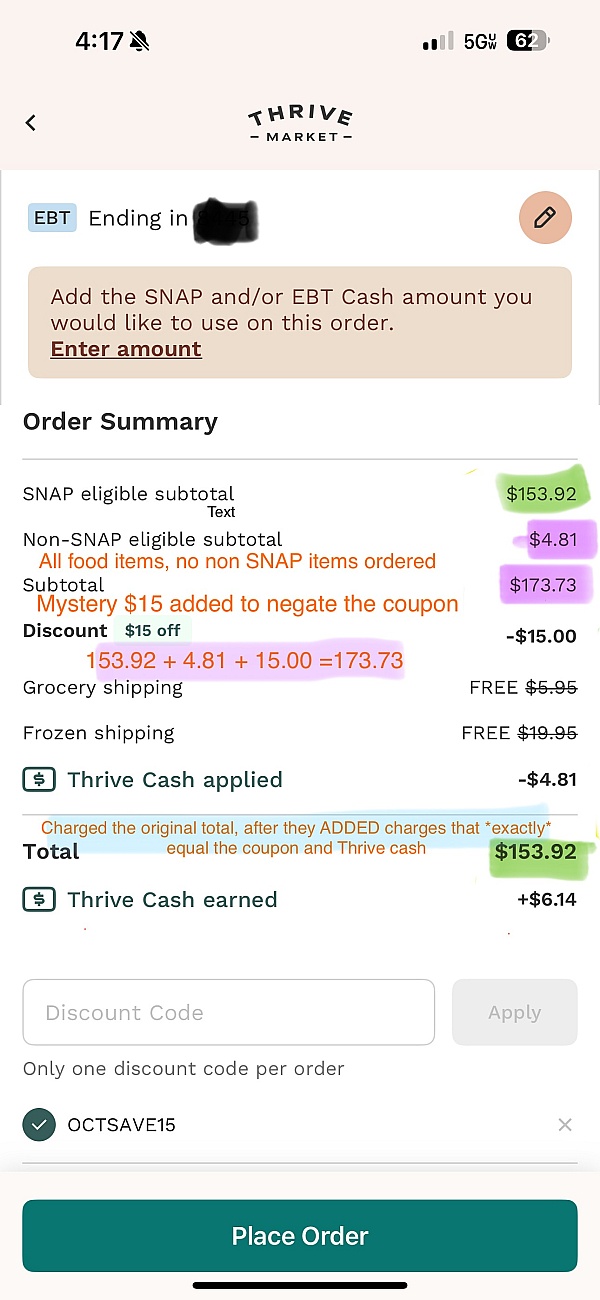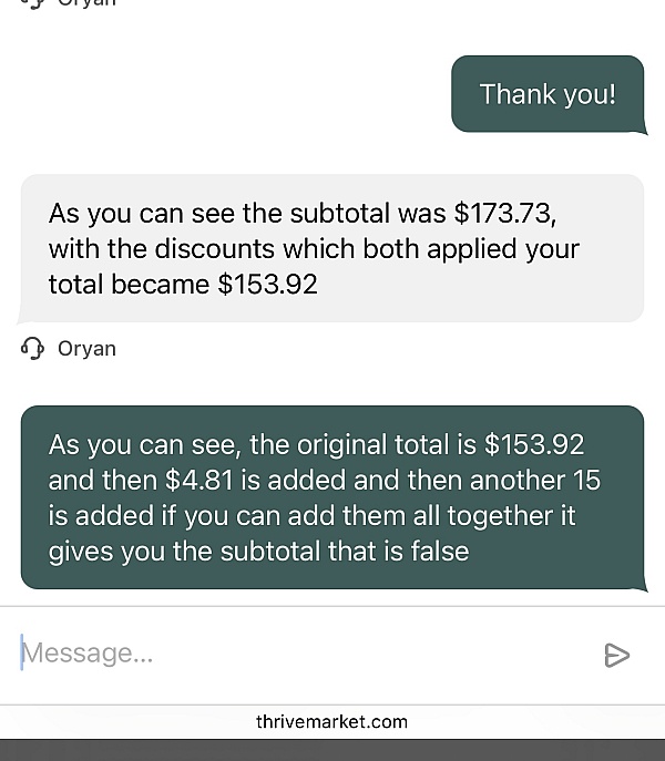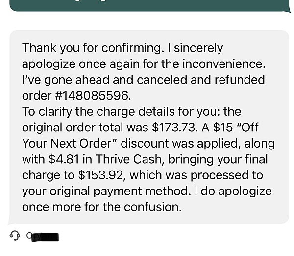 Answer: Contact your bank and challenge the charge. I have shopped with Thrive for almost 4 years. This is a glitch in their system. Any issues I have had have been quickly taken care of. Sorry you didn't have the same experience.