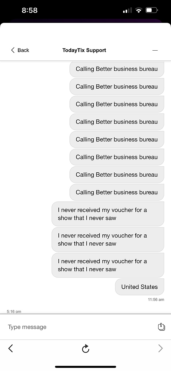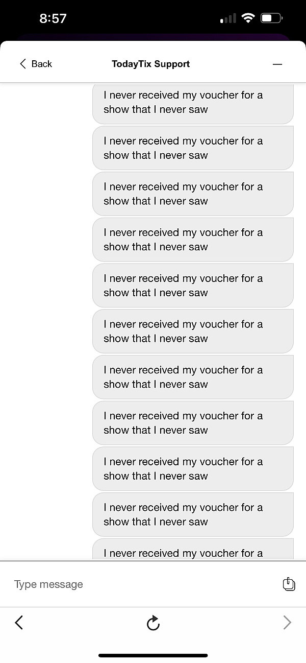 Please head to https://support.todaytix.com/support/home where you can submit a ticket, with your issue and quoting your sitejabber review. We would love to help!
