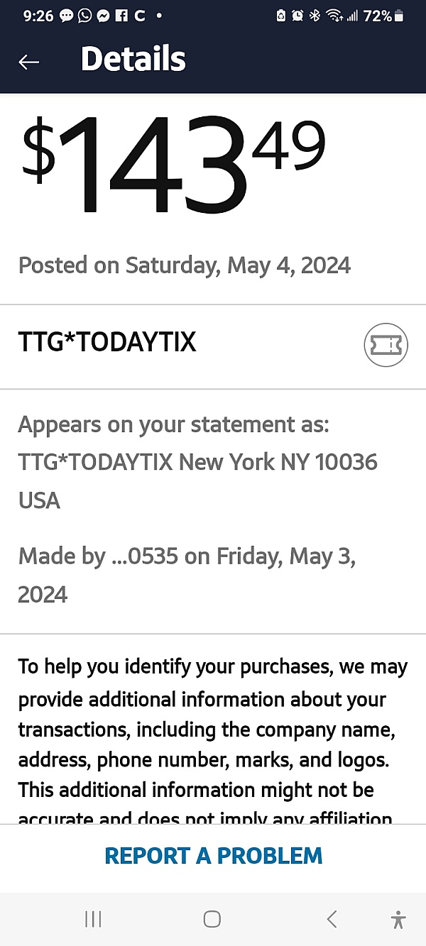 A text stating the initial charge for $143.49 didn't go through. I had a.51 cent credit. Lol. So, I ordered tickets again for the same day same time. Once I notice I was still charged for the first tickets, I asked for one of the charges to be refunded. I received and email not less than five minutes a credit was given. Thank you, thank you, thank you. I would give you a picture of the credit given but that will take 3-5 days to hit Mr credit card.