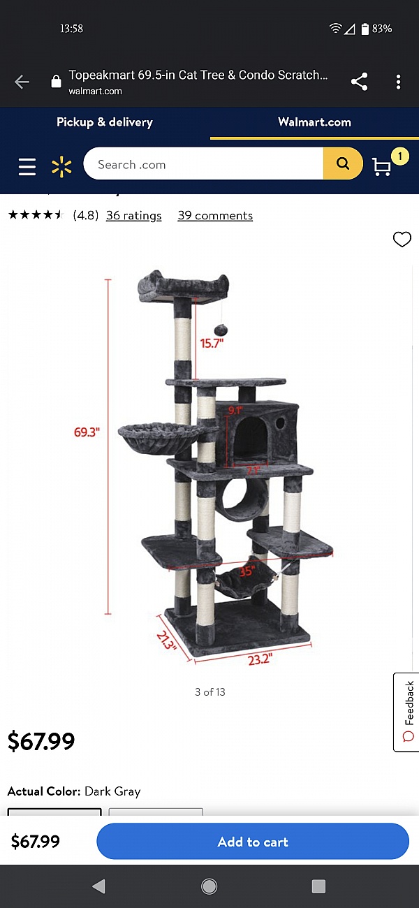 Ordered a cat tower with hammock, rotating tunnel, basket lounger, condo with window, perch, and all posts for scratching. Received one with hanging rope instead of tunnel, smaller condo without window, and half of the posts for scratching. Asked for correct item ordered for exchange or full refund. Offered a $10 refund to keep what I received. Same day they increased price on product online. Checked their website and the product I ordered says it's out of stock. Originally ordered from walmart.com from them as a third party seller. Had to have WalMart intervene to get a refund since they were unwilling to ship the correct product I ordered.