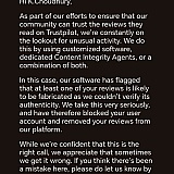 They've started mass deleting hundreds of thousands of genuine reviews (negative ones mainly - even from verified user's with evidence). I would imagine this is in exchange for money. They seem to especially target negative reviews for DEI/neo-Marxist companies like recently viral gaming consultancy company Sweet baby Inc. To top it off, I made a negative review for their own company stating why and that they would likely delete it - and they did. Proof attached.