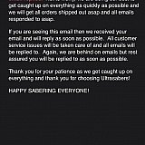 I've emailed ultrasabers about quality control issues with all four expensive sabers I bought from them. There is not yet any resolution to the issues I'm having with their sabers.