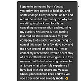 Their policy states that one should cancel before 30 days. My reservation was made less than 30 days ago, so it seems like your company is inappropriately withholding people's money and not allowing them to amend their stay dates. Both mine and my attorney have perused your policy. Your policy doesn't stipulate that you can withhold payment for guests who have not stayed over when your resort cannot accommodate requests for date changes. The BBB (Better Business Bureau) is also now involved as I am not the only guest mistreated in this way by your company.