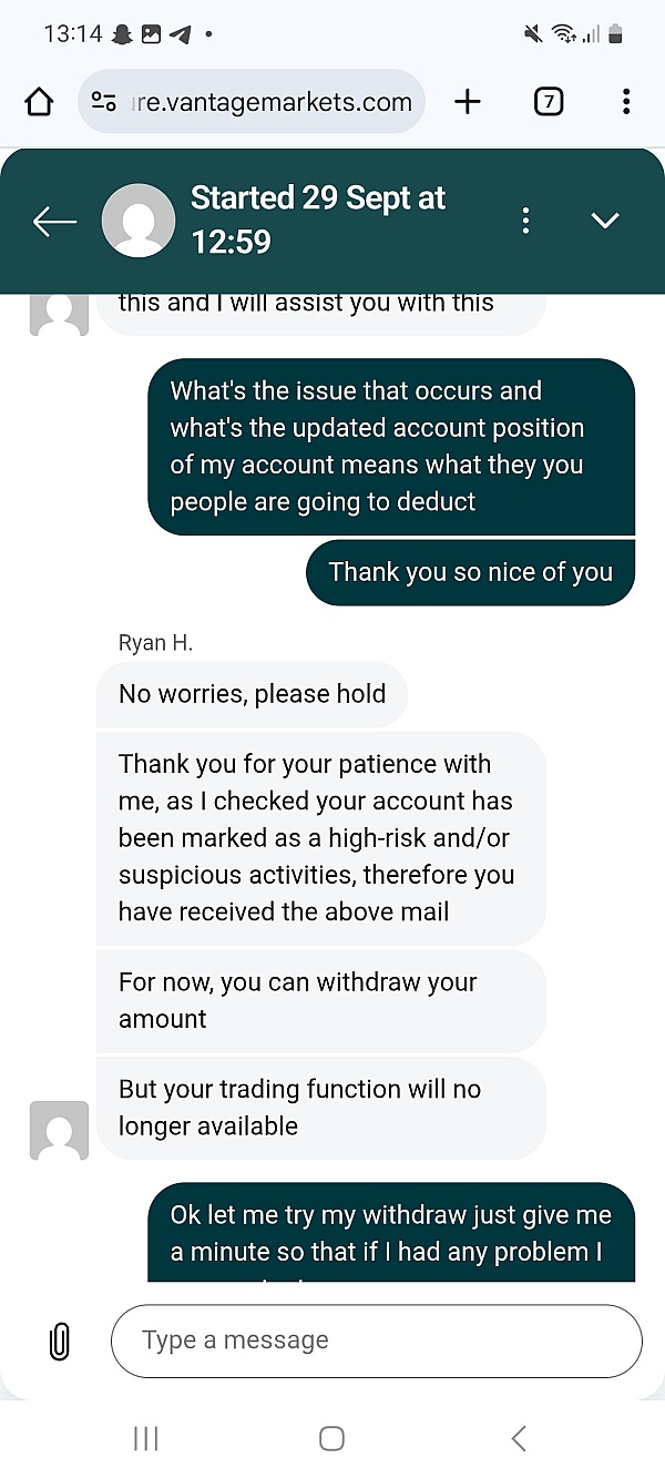 I have been working with them from a year but know they are just doing wrong kindly be active they just suspended my account in the name of suspicious activity with out providing any proofs and first stuck my funds then disappear them from account and I bear extreme loss of about 4000 dollars so this post is just for awareness for old vantage clients that be carefully and for new clients they are not good